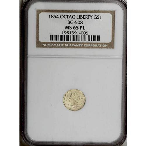 <B>1854 $1 Liberty Octagonal 1 Dollar, BG-508, High R.4, MS65 Prooflike NGC.</B></I> A gorgeous Gem with seamless, smooth mirrored fields and noticeable frost throughout the devices. The date is somewhat soft, but the remainder of the design is sharp. An exemplary Period One octagonal dollar.<BR><BR><b>Shipping:</b> Coin/Currency (<a target="_blank" href="http://www.heritageauctions.com/common/shipping.php">view shipping information</a>)