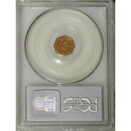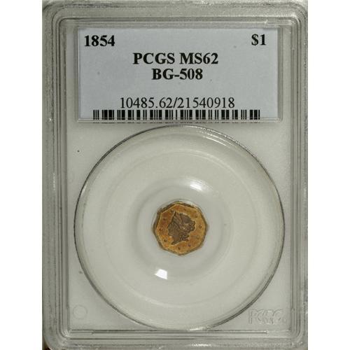 <B>1854 $1 Liberty Octagonal 1 Dollar, BG-508, High R.4, MS62 PCGS.</B></I> Cherry-red and peach-gold alternate across this moderately mirrored Period One gold dollar. A slender retained lamination crosses the reverse between 2 and 7 o'clock, but there are no consequential marks.<BR><BR><b>Shipping:</b> Coins & Currency (<a target="_blank" href="http://www.heritageauctions.com/common/shipping.php">view shipping information</a>)