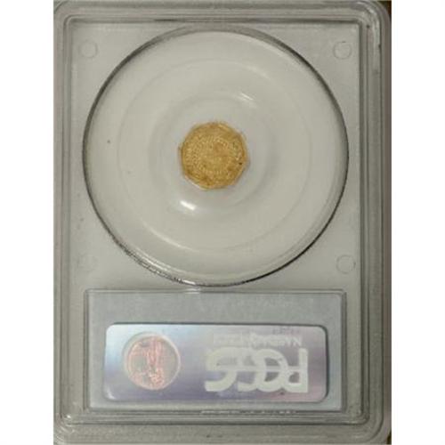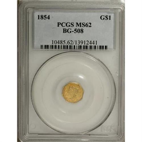 <B>1854 $1 Liberty Octagonal 1 Dollar, BG-508, High R.4, MS62 PCGS.</B></I> Orange toning overlies this small privately minted coin struck in California to relieve constant money shortages. A bit of weakness is visible on the date and at the high points of the hair. The surfaces are unusually smooth for the grade.<BR><BR><b>Shipping:</b> Coins & Currency (<a target="_blank" href="http://www.heritageauctions.com/common/shipping.php">view shipping information</a>)