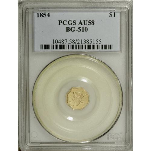 <B>1854 $1 Liberty Octagonal 1 Dollar, BG-510, Low R.5, AU58 PCGS.</B></I> A trifle scuffy in the fields, but hardly enough to impede the dazzling prooflike qualities of this light yellow-gold piece. The Period One fractional gold pieces are highly desirable, being considered by some as the true California Fractional gold coins, actually intended for use as money.<BR><BR><b>Shipping:</b> Coins & Currency (<a target="_blank" href="http://www.heritageauctions.com/common/shipping.php">view shipping information</a>)