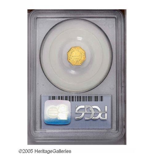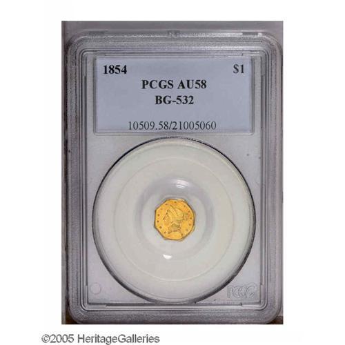 <B>1854<$1> Liberty Octagonal 1 Dollar, BG-532, Low R.4, AU58 PCGS.</B></I> Somewhat subdued in appearance, the surfaces are, nonetheless, originally toned in honey-gold color that successfully masks the few wispy abrasions that are present. A sharp piece despite light wear.<BR><I>From The Frank Manthey Collection of Gold Coins.</B></I>