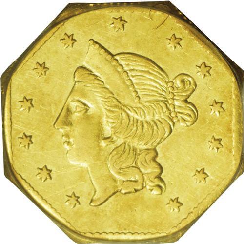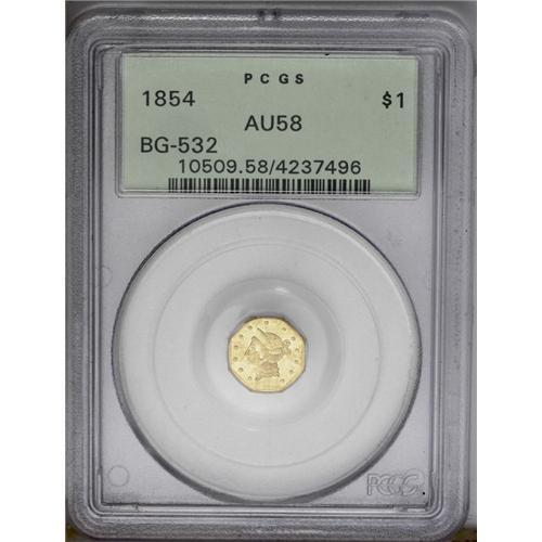<B>1854<$1> Liberty Octagonal 1 Dollar, BG-532, Low R.4, AU58 PCGS.</B></I> A touch of friction on the cheek and bust truncation denies a Mint State assessment, but luster remains plentiful. A couple of faint parallel marks cross Liberty's neck. Certified in a green label holder.<BR><I>From The Long Beach Family Collection.</B></I>