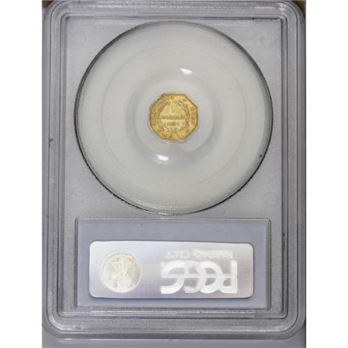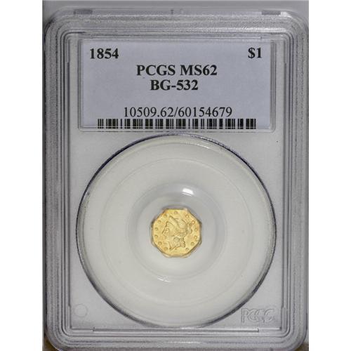 <B>1854<$1> Liberty Octagonal 1 Dollar, BG-532, Low R.4, MS62 PCGS.</B></I> Well struck and contact-free, with satiny surfaces that seem abrasion-free and exhibit wispy hairlines in the fields. Unlike their Period Two counterparts, the Period One pieces circulated in the years prior to silver coinage at the San Francisco Mint. Population: 13 in 62, 4 finer (3/06). <BR><BR><B>Important notice:</B> Heritage usually auctions material at the rate of 200-250 lots per hour. On some occasions eBay Live bid software or the Internet may not be able to keep up with the pace of the auction. We recommend placing a realistic absentee bid now as insurance to avoid disappointment. Occasionally the auctioneer may eliminate or reject an eBay Live bid, and the auctioneer may also reopen a lot after the close of the eBay live bidding (usually because we missed an audience bid), and may reject your bid even if it shows you as the winning bidder. By bidding via eBay Live, you agree that Heritage may award the lot to another bidder at its sole discretion under the circumstances described above or any other reasonable circumstances. Since eBay bids are not shown to us until we open the lot on the floor, we treat those bids just like floor bids. In most cases the floor responds before the eBay bid is presented to us, due to Internet lag time, so for consistency we have made it a policy that floor bids are always considered first over tie eBay live bids. Also please note that all Heritage lots purchased through eBay Live carry a 20% Buyer's Premium. Please make sure you read the Terms and Conditions before you bid. This lot is being auctioned in conjunction with a live floor auction by Heritage Galleries & Auctioneers. All final auction and invoice information will be supplied by Heritage Galleries & Auctioneers, and all other information should be considered preliminary. Lot:4783 <BR><BR><B>Winning Notification and Billing:</B> After the FINAL session in this auction is complete, Heritage will send e-mail and snail mail invoices. This process normally takes several days. All final auction and invoice information will be supplied by Heritage Galleries & Auctioneers, and all other information should be considered preliminary. <BR><BR>This auction will be conducted on a live auction floor and over the Internet through eBay Live. If you choose to place an absentee bid, please take a moment to <font color='#0000ff'><u><a href='http://pages.ebay.com/liveauctions/help/before/laabsentee.html'>learn how eBay Live absentee bidding works</a></u></font><font color='#000000'>