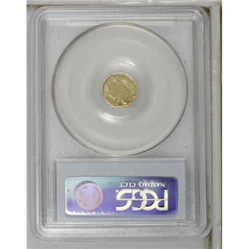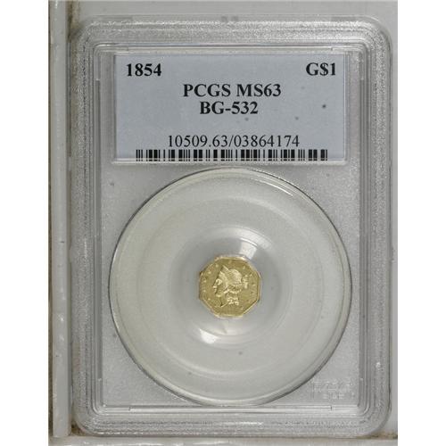 <B>1854 $1 Liberty Octagonal 1 Dollar, BG-532, Low R.4, MS63 PCGS.</B></I> A flashy canary-gold representative of this scarce California issue, crisply struck with considerable eye appeal that suggests conservative grading. An unusually well-preserved example of this Period One issue by Nouizillet, one almost always found in circulated condition, and the finest example offered by Heritage in recent memory. Population: 3 in 63, 1 finer (2/07).<BR><BR><b>Shipping:</b> Coins & Currency (<a target="_blank" href="http://www.heritageauctions.com/common/shipping.php">view shipping information</a>)