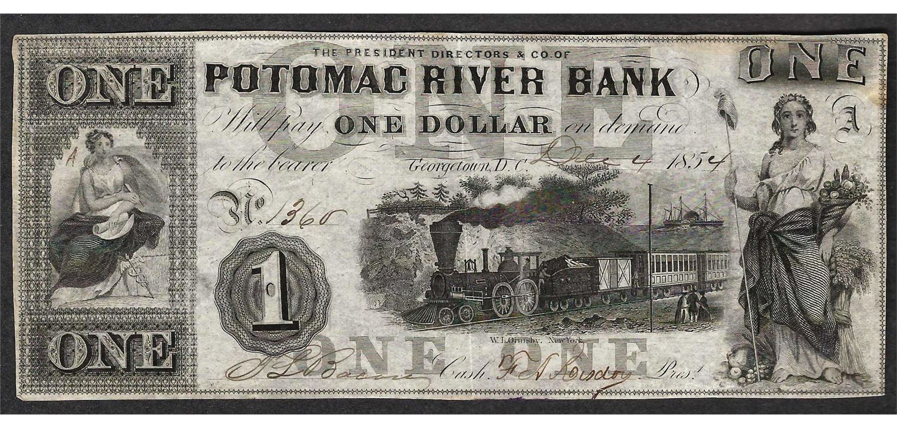 One 1854 $1 Potomac River Bank Obsolete Note.