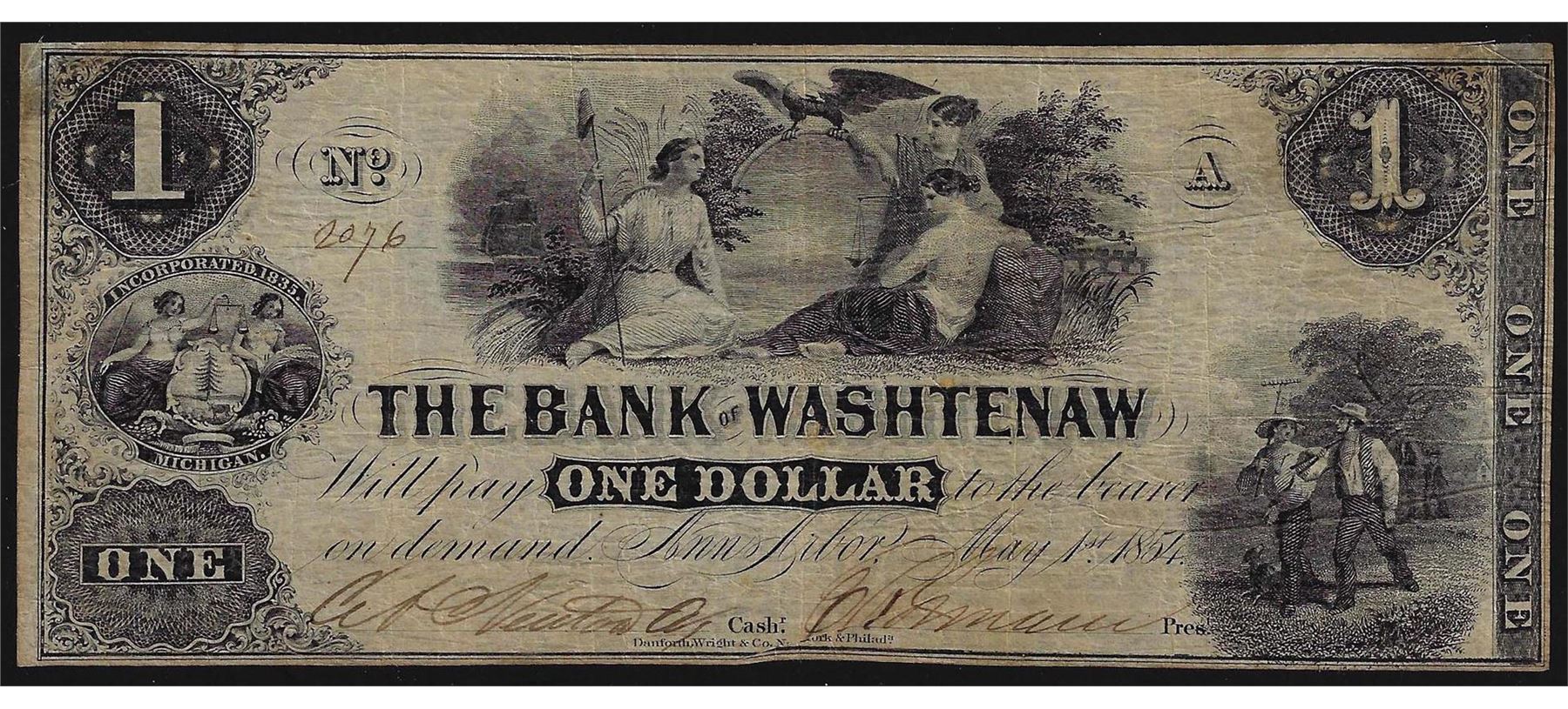 One 1854 $1 The Bank of Washtenaw Obsolete Bank Note.