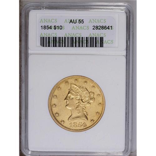 <B>1854<$10> AU55 ANACS.</B></I> The base of the 1 is lightly repunched. A glossy and nicely struck example that has the customary number of small marks from brief circulation. Only 54,250 pieces were struck of this better date but affordable No Motto issue.