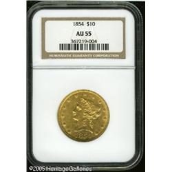 <B>1854 $10 AU55 NGC.</B></I> This is a pleasing example with nearly full yellow-gold luster and excellent eye appeal. The surfaces are lightly abraded as expected for the grade.<BR><I>From The Richard J. Chouinard Collection of United States Coins, Part Two.</B></I> Lot:8748