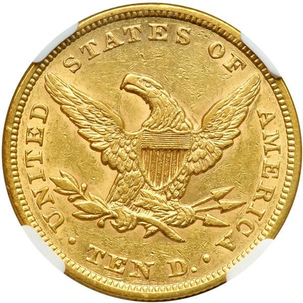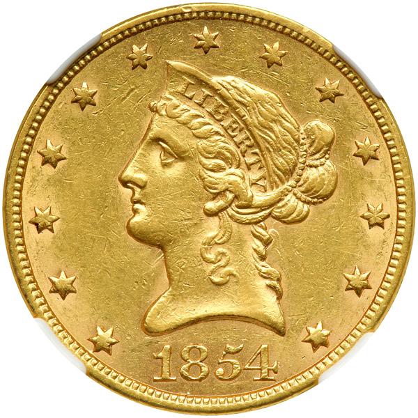 1854. NGC graded AU-53. A hint of light gold tone and a well struck example of the desirable No Motto Type which ran from 1838 to 1866 (PCGS # 8613) .