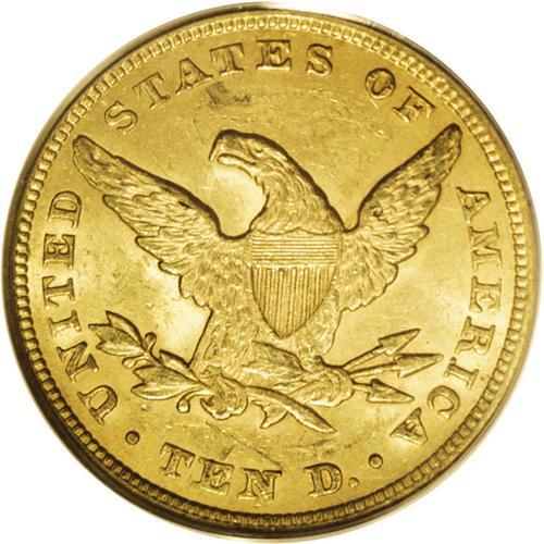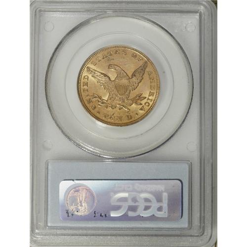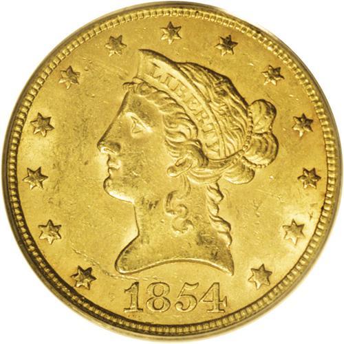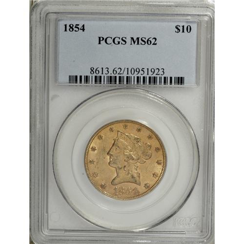 <B>1854 $10 MS62 PCGS.</B></I> Many collectors are unaware of how elusive Mint State examples of this issue are, though specialists have sought attractive pieces for some time. The orange-gold surfaces of this piece have a hint of emerald in the lustrous fields. Well struck with few marks on the devices, though an abrasion to the left of the date and a pair of such marks below the eagle limit the grade. Population: 3 in 62, 2 finer (12/06).<BR><BR><b>Shipping:</b> Coin/Currency (<a target="_blank" href="http://www.heritageauctions.com/common/shipping.php">view shipping information</a>)