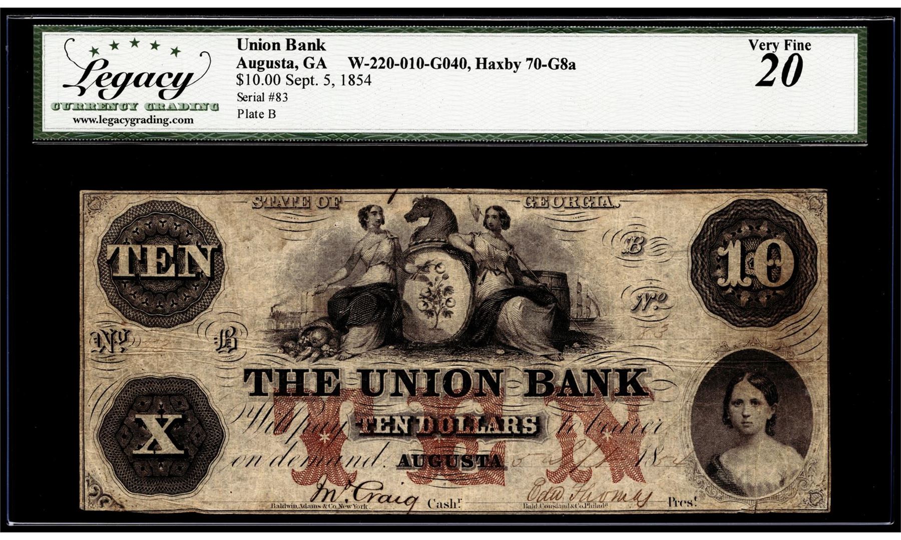 One 1854 $10 The Union Bank Augusta, GA Obsolete Note Legacy Very Fine 20. Legacy Graded.