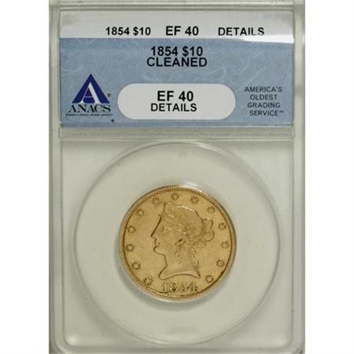 <B>1854 $10 --Cleaned--ANACS. XF40 Details. </B></I>Population: 20 in 40, 70 finer (11/07).Census: 13 in 40, 195 finer (11/07). (#8613)<BR><BR><B>Coin Engraver:</B> Christian Gobrecht<BR><BR><b>Shipping:</b> Coins & Currency (<a target="_blank" href="http://www.heritageauctions.com/common/shipping.php">view shipping information</a>)