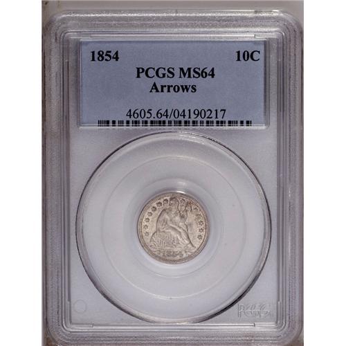 <B>1854 10C Arrows MS64 PCGS.</B></I> Dappled golden-brown and pearl-gray colors endow this reasonably struck and carefully preserved type coin. Surprisingly difficult in Mint State, despite a plentiful mintage.