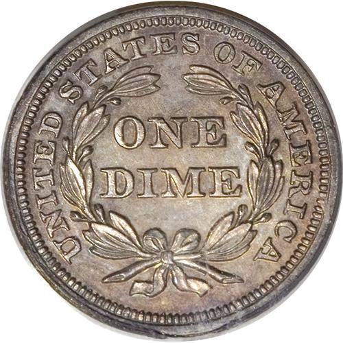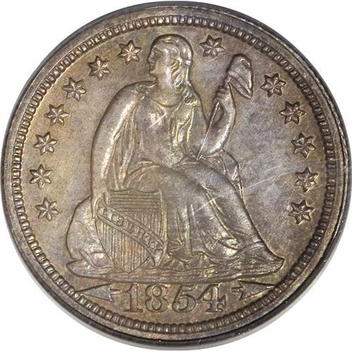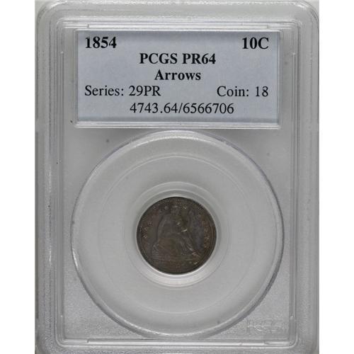 <B>1854 10C Arrows PR64 PCGS.</B></I> According to <I>Walter Breen's Encyclopedia of United States and Colonial Proof Coins,</B></I> the diagnostics for proof 1854 dimes include all digits and arrows touching the base and the 54 in the date touching each other. This coin meets those criteria, and further establishes its proof status by its razor-sharp strike and the polished fields, which, while not quite as reflective as the fields found on later proofs of the type, are completely in line with those found on other pre-1858 proof coinage. Polishing lines are readily evident through the reverse fields. Rose-gray in color, this coin is seemingly limited in grade only by a few pinpricks in the obverse field. Indeed, it is difficult even to determine a pedigree mark on this piece.<BR> While the 1854 dime is one of the more common dates in the series as a circulation strike, it must be stressed that this is a very rare piece as a proof, with an estimated mintage of only 15 pieces and a certified population of 16, including resubmissions, at the two major grading services combined. A search through our records shows that this is only the second such piece we've ever had the pleasure of offering, and indeed, only two other proof 1854 dimes have appeared at any public auction since the turn of the millennium. This is an opportunity for the specialist in Seated dimes or early proof coins to acquire a piece that appears in the market only with great infrequency; indeed, it may be several years before another proof 1854 dime becomes available at any price.<BR><BR><b>Shipping:</b> Coins & Currency (<a target="_blank" href="http://www.heritageauctions.com/common/shipping.php">view shipping information</a>)