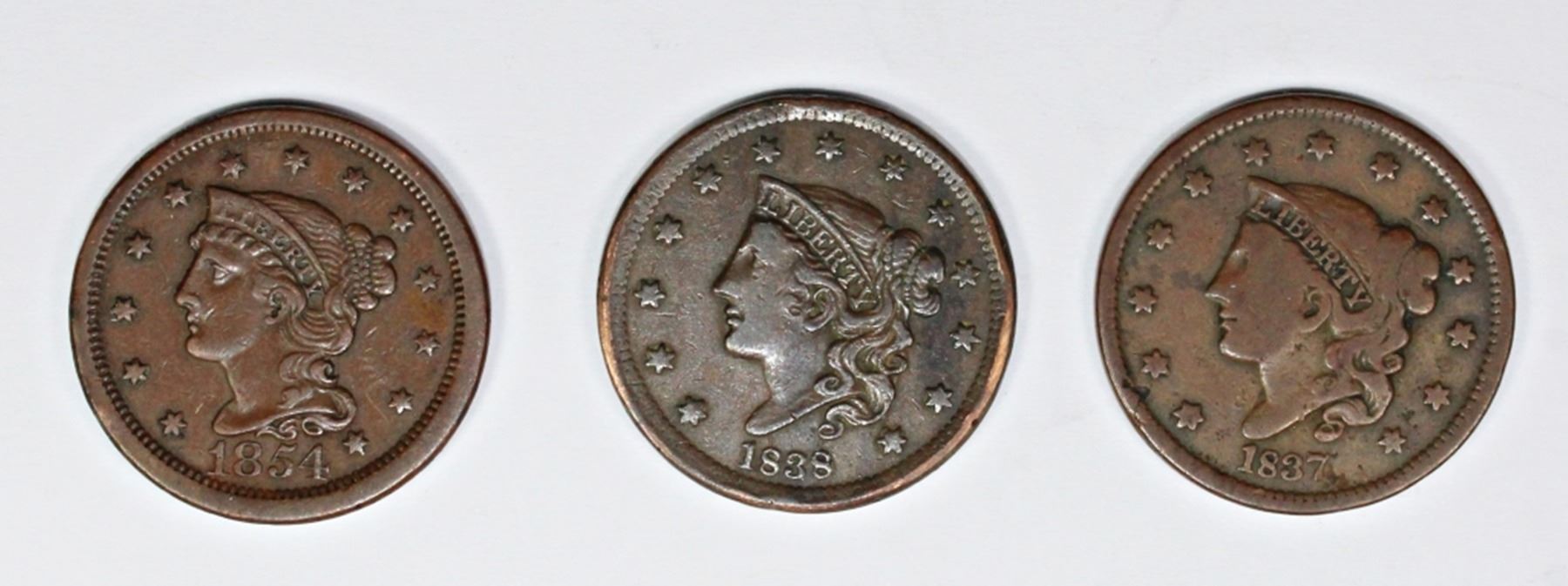 1854, 1838, AND 1837 U.S. LARGE CENTS