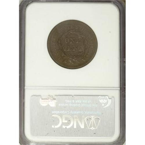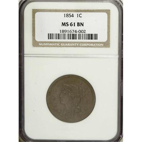 <B>1854 1C MS61 Brown NGC.</B></I> NGC Census: (20/436). PCGS Population (3/202). Mintage: 4,236,156. Numismedia Wsl. Price for NGC/PCGS coin in MS61: $155. (#1904)<BR><BR><B>Coin Engraver:</B> Christian Gobrecht<BR><BR><b>Shipping:</b> Coins & Currency (<a target="_blank" href="http://www.heritageauctions.com/common/shipping.php">view shipping information</a>)