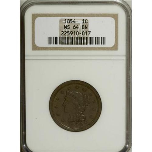 <B>1854 1C MS64 Brown NGC.</B></I> NGC Census: (135/156). PCGS Population (71/28). Mintage: 4,236,156. Numismedia Wsl. Price for NGC/PCGS coin in MS64: $300. (#1904)<BR><BR><B>Coin Engraver:</B> Christian Gobrecht<BR><BR><b>Shipping:</b> Coins & Currency (<a target="_blank" href="http://www.heritageauctions.com/common/shipping.php">view shipping information</a>\)