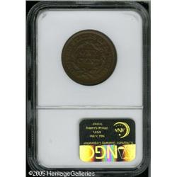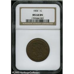 <B>1854 1C MS64 Brown NGC.</B></I> N-11, R.2. Golden-brown color dominates this suitably struck Mature Head Cent, however, glimpses of original crimson color appear near the reverse legends. Nicely struck and unabraded. Small spots are near the back corner of the eye and on the M in AMERICA. Lot:5162