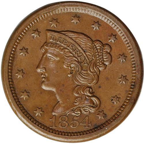 <B>1854<1C> N-20, R.3. AU50 EAC.</B></I> Removed from the NGC holder for better examination. NGC had graded this MS63 Brown. Grellman state c. This is the unique "terminal die state" example reported with a rim cud over star 6. We do not believe that this is actually a rim break, but rather a minting anomaly. While the fields are lightly flowlined, and the reverse is sinking slightly around the legend, most or all of the points that eventually fade and disappear, including the lines at Liberty's throat, actually remain visible on this example. We cannot think of a scenario where characteristics of both the early die state and the late die state are both visible on the same coin. Bob Grellman recently examined this coin, and explained that the "cud" is actually a fold in the metal that accorded at the time it was struck. Envelope Included.