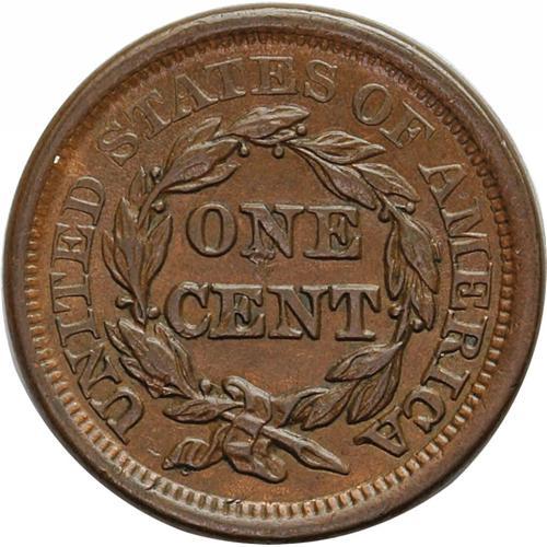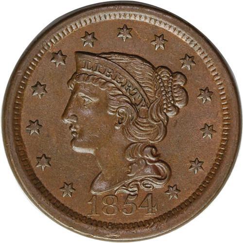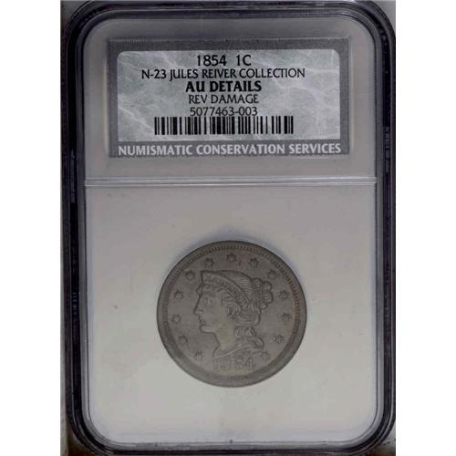<B>1854<1C> N-23, R.2--Reverse Damage--NCS. AU Details. AU50 EAC.</B></I> Grellman state b. The reverse has a faint clash mark from the right top of T in CENT. Pleasing medium brown surfaces with a small scrape from N of ONE to E of CENT.
