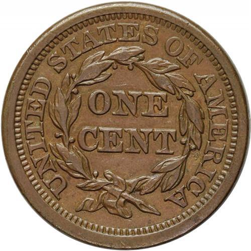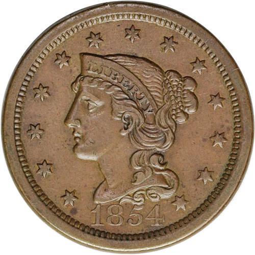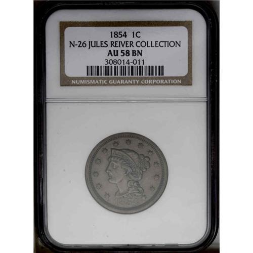<B>1854<1C> N-26, High R.3. AU58 NGC. VF35 EAC.</B></I> Grellman state a as always. Light chestnut brown obverse with pale olive on the reverse. A few trivial surface marks are present, as well as splashes of darker patina.<BR><I>Ex: George Ramont (6/17/1971).</B></I>