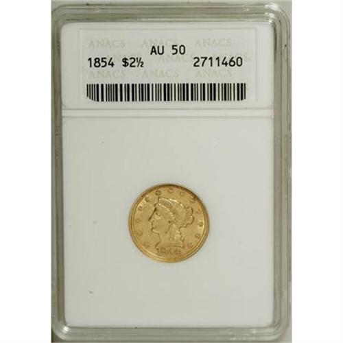 <B>1854 $2 1/2 AU50 ANACS.</B></I> NGC Census: (5/414). PCGS Population (15/211). Mintage: 596,258. Numismedia Wsl. Price for NGC/PCGS coin in AU50: $188. (#7769)<BR><BR><B>Coin Engraver:</B> Christian Gobrecht<BR><BR><b>Shipping:</b> Coins & Currency (<a target="_blank" href="http://www.heritageauctions.com/common/shipping.php">view shipping information</a>\)
