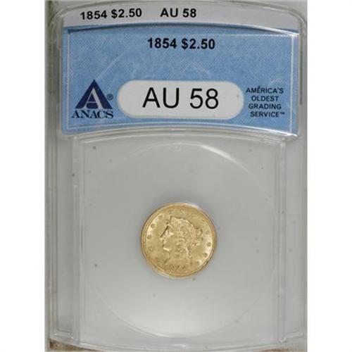 <B>1854 $2 1/2 AU58 ANACS.</B></I> NGC Census: (129/261). PCGS Population (45/94). Mintage: 596,258. Numismedia Wsl. Price for NGC/PCGS coin in AU58: $230. (#7769)<BR><BR><b>Shipping:</b> Coins & Currency (<a target="_blank" href="http://www.heritageauctions.com/common/shipping.php">view shipping information</a>)