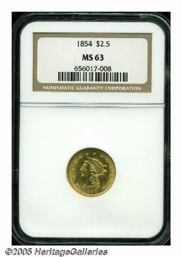 <B>1854<$2 1/2> MS63 NGC.</B></I> Readily available in lower grades, but scarce in Mint State. This MS63 specimen features bright, lustrous surfaces displaying peach-gold patination, and nicely struck devices. A few obverse marks limit the grade. Population: 39 in 63, 23 finer (5/05).