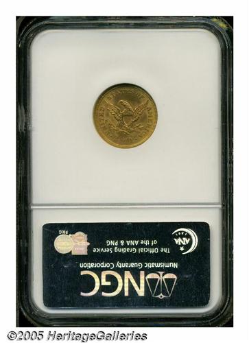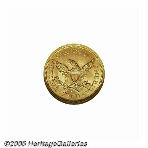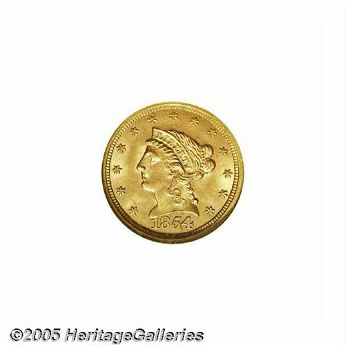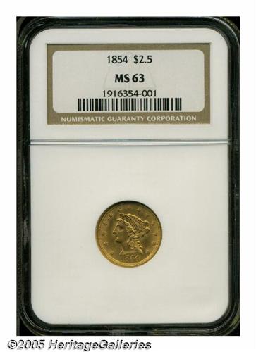 <B>1854<$2 1/2> MS63 NGC.</B></I> Sharply defined, except on the eagle's leg, with exceptionally smooth surfaces and evidence of light die clashing on each side. A premium example of this popular date. Medium red-golden toning overall. Population: 39 in 63, 23 finer (5/05).