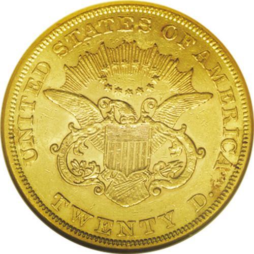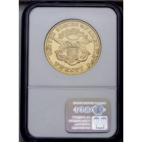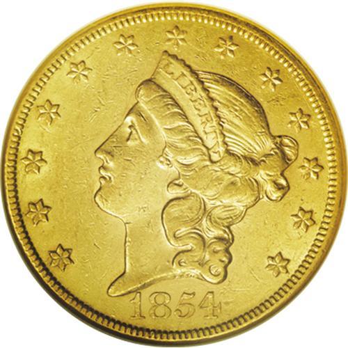 <B>1854<$20> Large Date AU53 NGC.</B></I> Although few collectors seek out special varieties of double eagles, certain date variations should be considered important enough to be collected in addition to the basic set. Given its listing in the current edition of the <I>Guide Book,</B></I> the 1854 Large Date is one of those important variations. While the difference in the actual size of the Small Date (Dave Bowers suggests calling it a Medium Date) and the Large Date are not that great, they remain distinctive varieties, and the Large Date variety comprised a minority of the 757,899 double eagles coined in Philadelphia during the year. This example is a lustrous yellow-gold representative with scattered abrasions and traces of high-point wear. A few small traces of russet verdigris are visible on the reverse surface. Overall, a pleasing and important example of this elusive variety.<BR><I>From The Wyoming Collection.</B></I>
