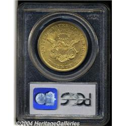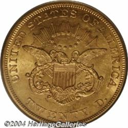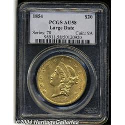 <B>1854<$20> Large Date AU58 PCGS.</B></I> The 1854 is a scarcer date in AU grades, and in Uncirculated condition it is a very rare and overlooked issue. Probably 90% of the 1854 double eagles extant are of the Small Date variety; however, a small number are known with a large date. Apparently the Large Date variant was struck from the logotype used for silver dollars, and survivors in any grade, but especially AU58 and better, are extremely rare.<BR> This piece has strong definition on all the design elements and most of the original mint luster is still seen in the fields, although a bit thin. Very clean overall with the most obvious impairments being a short diagonal streak of grease (as struck) on the right side of the shield, and a small mark between the eagle's left (facing) wing and the left side of the rays.<BR> The Condition Census for the Large Date 1854 appears to start at the AU55 level, placing this coin somewhere in the lower range of the C.C. The Large Date will undoubtedly become an integral part of the Type One series as it becomes better known. Population: 6 in 58, 0 finer (3/04). <BR><BR><B>Important notice:</B> Heritage usually auctions material at the rate of 200-250 lots per hour. On some occasions eBay Live bid software or the Internet may not be able to keep up with the pace of the auction. We recommend placing a realistic absentee bid now as insurance to avoid disappointment. Occasionally the auctioneer may eliminate or reject an eBay Live bid, and the auctioneer may also reopen a lot after the close of the eBay live bidding (usually because we missed an audience bid), and may reject your bid even if it shows you as the winning bidder. By bidding via eBay Live, you agree that Heritage may award the lot to another bidder at its sole discretion under the circumstances described above or any other reasonable circumstances. Since eBay bids are not shown to us until we open the lot on the floor, we treat those bids just like floor bids. In most cases the floor responds before the eBay bid is presented to us, due to Internet lag time, so for consistency we have made it a policy that floor bids are always considered first over tie eBay live bids. Also please note that all Heritage lots purchased through eBay Live carry a 20% Buyer's Premium. Please make sure you read the Terms and Conditions before you bid. </span></font></tr></table></td></tr></table>