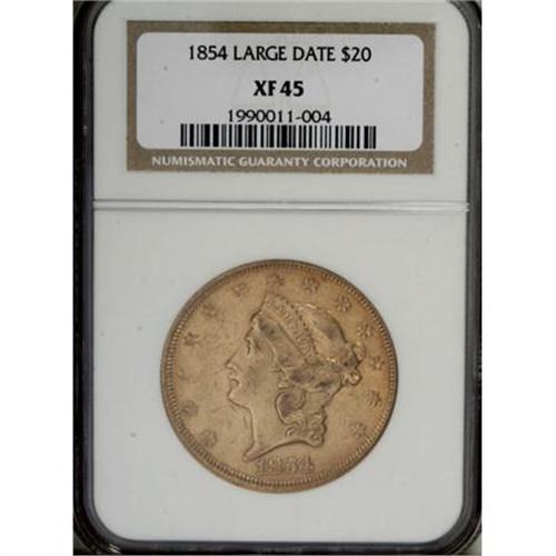 <B>1854 $20 Small Date XF45 NGC.</B></I> Incorrectly certified as a Large Date. Despite light, even wear, this orange-gold example shows subtle luster at the margins. Typically struck with a number of light to moderate abrasions that pepper each side.<BR><BR><B>Coin Engraver:</B> James B. Longacre<BR><BR><b>Shipping:</b> Coins & Currency (<a target="_blank" href="http://www.heritageauctions.com/common/shipping.php">view shipping information</a>)<BR><BR><B>Important notice:</B> Heritage usually auctions material at the rate of 200-250 lots per hour. On some occasions eBay Live bid software or the Internet may not be able to keep up with the pace of the auction. We recommend placing a realistic absentee bid now as insurance to avoid disappointment. Occasionally the auctioneer may eliminate or reject an eBay Live bid, and the auctioneer may also reopen a lot after the close of the eBay live bidding (usually because we missed an audience bid), and may reject your bid even if it shows you as the winning bidder. By bidding via eBay Live, you agree that Heritage may award the lot to another bidder at its sole discretion under the circumstances described above or any other reasonable circumstances. Since eBay bids are not shown to us until we open the lot on the floor, we treat those bids just like floor bids. In most cases the floor responds before the eBay bid is presented to us, due to Internet lag time, so for consistency we have made it a policy that floor bids are always considered first over tie eBay live bids. Also please note that all Heritage lots purchased through eBay Live carry a 20% Buyer's Premium with a $9 minimum Buyer's Premium. Please make sure you read the Terms and Conditions before you bid. This lot is being auctioned in conjunction with a live floor auction by Heritage Auctions. All final auction and invoice information will be supplied by Heritage Auctions, and all other information should be considered preliminary. Lot:2674<BR><BR><B>Winning Notification and Billing:</B> After the FINAL session in this auction is complete, Heritage will send e-mail and snail mail invoices. This process normally takes several days. All final auction and invoice information will be supplied by Heritage Auctions, and all other information should be considered preliminary. <BR><BR><B>Second Chance Offers:</B> Heritage does not make Second Chance Offers. Once our auction ends, if you receive a Second Chance Offer to buy this item DO NOT accept the offer. Please forward any Second Chance offer emails received on one of our auctions to eBay's Safe Harbor Department. <BR><BR>This auction will be conducted on a live auction floor and over the Internet through eBay Live. If you choose to place an absentee bid, please take a moment to <font color='#0000ff'><u><a href='http://pages.ebay.com/liveauctions/help/before/laabsentee.html'>learn how eBay Live absentee bidding works</a></u></font><font color='#000000'>