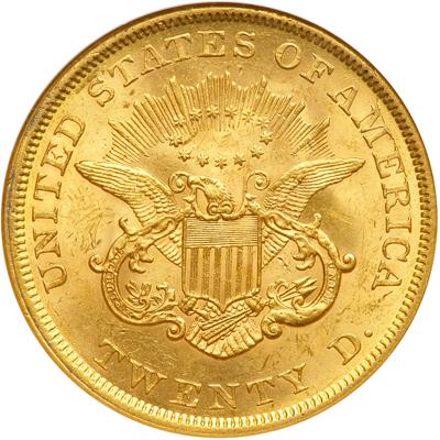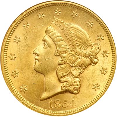 1854 $20 Liberty. Small date. NGC graded MS-62. There are two major varieties of the 1854 double eagle. The first and most common variety is the 1854 with Small date. Most of the 1854 double eagles seen are of this variety. The overall rarity is very similar to that of the 1852 and 1853 issues, according to Garrett and Guth in their U.S. Gold Coins reference work. The surfaces of this piece are remarkably clean for the period and show thick, frosted mint luster, somewhat muted in areas but covering the surface completely. Light reddish-gold color is seen over both obverse and reverse, and the striking details are sharply defined throughout. There is a faint mark on Liberty's cheek. A few light luster grazes around the eagle on the reverse, as well. Pop 4; none finer at NGC. (PCGS # 8911).