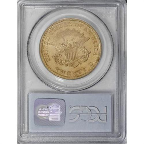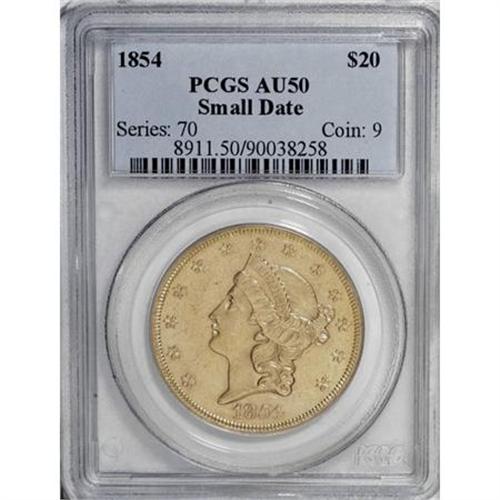 <B>1854 $20 Small Date AU50 PCGS.</B></I> Luster brightens the stars, legends, and devices of this crisply impressed, mildly glossy, and only briefly circulated double eagle. Philadelphia double eagle mintages dropped annually between 1852 and 1856, as California-mined bullion began making its way to the U.S. Assay Office and San Francisco Mint.<BR><BR><b>Shipping:</b> Coins & Currency (<a target="_blank" href="http://www.heritageauctions.com/common/shipping.php">view shipping information</a>)
