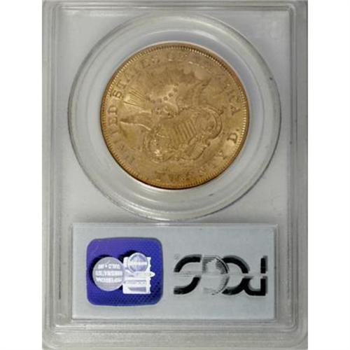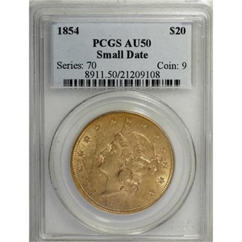 <B>1854 $20 Small Date AU50 PCGS.</B></I> Olive-green surfaces shimmer with lots of luster, much more than one often sees on an AU50 example. Numerous marks are present on both sides, and a long diagonal scratch from Liberty's mouth to her hair is noted, as is a scratch by the first star to the right on the obverse. <BR><BR><B>Coin Engraver:</B> James B. Longacre<BR><BR><b>Shipping:</b> Coins & Currency (<a target="_blank" href="http://www.heritageauctions.com/common/shipping.php">view shipping information</a>)