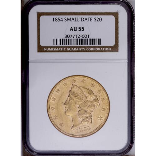 <B>1854<$20> Small Date AU55 NGC.</B></I> Bright luster outlines the obverse stars individually, but does not join them together. The honey-gold surfaces display many small marks, although none are worthy of singular description.