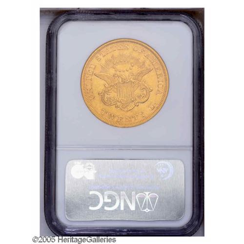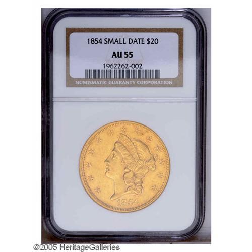 <B>1854<$20> Small Date AU55 NGC.</B></I> Glimmering luster is particularly extensive on the reverse. This glossy Double Eagle has a few small planchet flaws (as made) along the right obverse border but is less abraded than expected for the grade.<BR><I>From The Henry R. Luhrs Collection.</B></I>