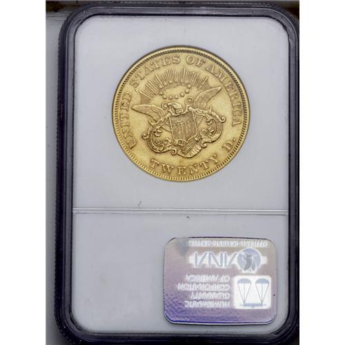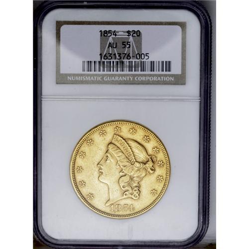 <B>1854<$20> Small Date AU55 NGC.</B></I> The Small Date variety of the year. Here is another early double eagle that is typically encountered in VF to XF, but according to Akers, AU examples of the date are available "from time to time." A fair amount of luster is present, as are a few scattered circulation marks, yet the overall quality is still quite nice for the assigned grade. The light greenish and peach coloration is especially pleasing.
