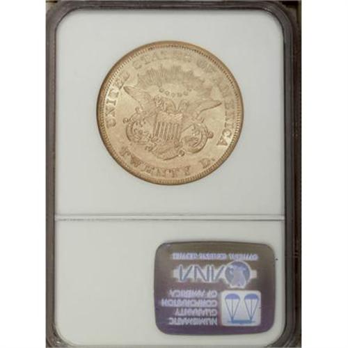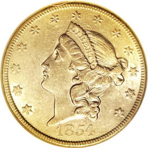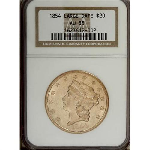 <B>1854 $20 Large Date AU55 NGC.</B></I> The Large Date and Small Date are sometimes confused, even by the grading services. However, a side by side comparison shows that the Large Date logotype has a stretched appearance, while the Small Date logotype appears squat. The Large Date is several times rarer than the Small Date. The present partly lustrous example has a good strike. Moderate marks are seen near the profile and above the TW in TWENTY. Census: 18 in 55, 22 finer (2/08).<BR><BR><b>Shipping:</b> Coins & Currency (<a target="_blank" href="http://www.heritageauctions.com/common/shipping.php">view shipping information</a>)