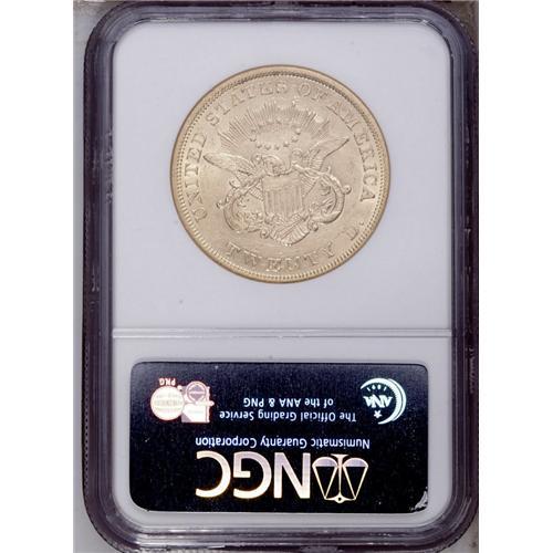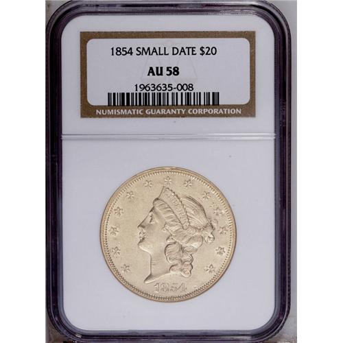 <B>1854 $20 Small Date AU58 NGC.</B></I> Bright, partially lustrous, and moderately abraded throughout. Slight wear is visible on the highpoints. A scarce issue in Mint State grades.
