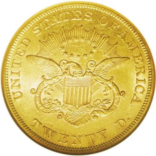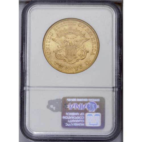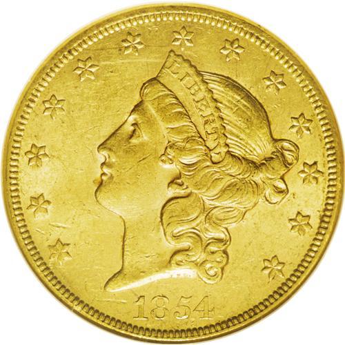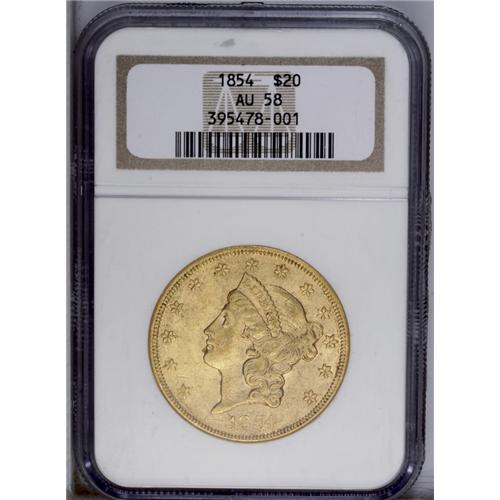 <B>1854<$20> Small Date AU58 NGC.</B></I> This lightly circulated example is a normal yellow-gold color with part of its natural luster intact. It exhibits wear and circulation marks as a lightly circulated large gold coin would. There are a couple of mentionable obverse marks: one to the left of the date, the other between stars 1 and 2.