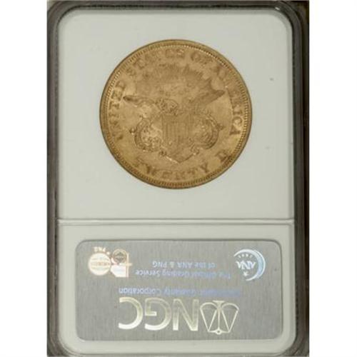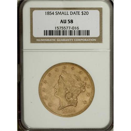 <B>1854 $20 Small Date AU58 NGC.</B></I> An attractive near-Mint example of this P-mint double eagle variant, more available than its Large Date counterpart. Decisively struck with luminous, dusky antique-gold surfaces that show myriad minor marks but just a hint of friction.<BR><BR><B>Coin Engraver:</B> James B. Longacre<BR><BR><b>Shipping:</b> Coins & Currency (<a target="_blank" href="http://www.heritageauctions.com/common/shipping.php">view shipping information</a>\)