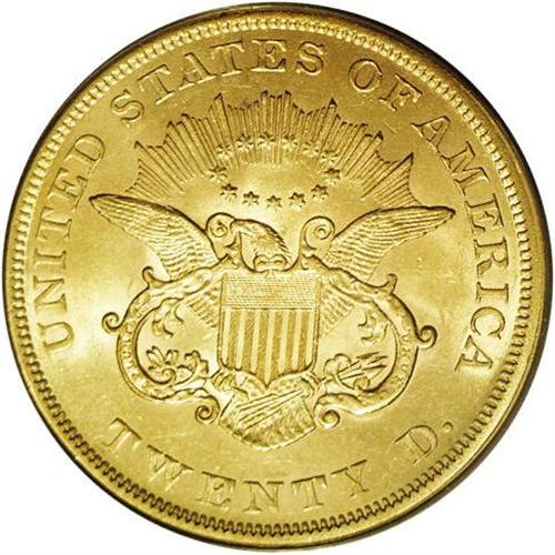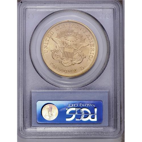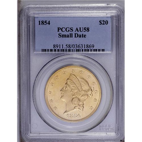 <B>1854<$20> Small Date AU58 PCGS.</B></I> The 1854 double eagle is readily available through VF and XF grades. It becomes scarce in lower AU, and is very scarce in high-end AU. Mint State coins are difficult to obtain. This AU58 specimen retains considerable luster on its apricot-gold surfaces, and is sharply defined on the design elements. Both sides are relatively clean, which is atypical for this issue, as it is "usually covered with deep, detracting abrasions" (Winter and Crum, 2002). A few minor contact and slide marks are noted on the obverse. Population: 25 in 58, 21 finer (2/06).