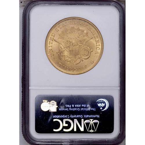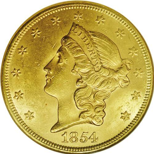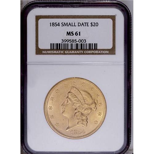 <B>1854<$20> Small Date MS61 NGC.</B></I> The 1854-P is extremely scarce in Mint State and typically of average quality at best. Conditionally scarce, this piece has most of the original pinkish-gold colored mint luster still intact. The surfaces are lightly abraded and the striking details remarkably bold. Census: 19 in 61, 10 finer (2/06).