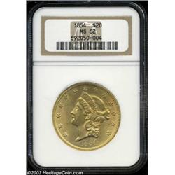 <table><tr><td><TABLE cellSpacing=0 cellPadding=0 width="100%" bgColor=#000000 border=0><TBODY> <TR><TD width="100%"><TABLE cellSpacing=1 cellPadding=3 width="100%" border=0><TBODY><TR><TD width="100%" bgColor=#79735c><FONT face=arial color=#ffffff size=3><B>Description</B> </FONT></TD></TR><TR><TD width="100%" bgColor=#ffffff><FONT face=arial size=2><B>1854 $20 Small Date MS62 NGC.</B></I> Of the 17 Type One Double Eagles, the 1854 is the thirteenth rarest overall. While common in nearly all circulated grades, it is much harder to locate in Uncirculated than usually acknowledged. An estimated 20-25 Mint State coins are known, nearly all falling in the MS60-62 grade range. In MS62, the 1854 is a very scarce and extremely undervalued issue. This piece is very sharply defined and shows light orange-gold tinted mint luster over very satiny surfaces. The only obvious abrasion is noted on Liberty's cheek. A Large Date variety is also known, but is very scarce in all grades and extremely rare above AU55. </FONT></TD></TR></TBODY></TABLE></TD></TR></TBODY></TABLE><BR><A name=PricesRealized></A><TABLE cellSpacing=0 cellPadding=0 width="100%" bgColor=#000000 border=0><TBODY><TR><TD width="100%"><TABLE cellSpacing=1 cellPadding=3 width="100%" border=0><TBODY><TR><TD width="100%" bgColor=#79735c><A name=PR><FONT face=arial color=#ffffff size=3><B>Previous Prices from Heritage Auctions</B> </FONT></A></TD></TR><TR><TD bgColor=#f6f6ed><TABLE cellSpacing=0 cellPadding=0 width="100%" border=1><TBODY><TR><TD align=middle width="33%"><B>Date</B></TD><TD align=middle width="33%"><B>Service</B></TD><TD align=middle width="33%"><B>Price</B></TD></TR><TR bgColor=whitesmoke><TD width="33%"><B>12/01/2000</B></TD><TD width="33%">PCGS</TD><TD width="33%">$14,950.00</TD></TR></TBODY></TABLE></TD></TR><TR><TD bgColor=#ffffff><FONT face=arial size=1 ?>PLEASE NOTE: All prices realized reflect the final hammer price PLUS the buyer's premium in auctions that charge a buyer's premium. Each item has a notation at the top of the listing indicating whether that lot included a buyer's premium. Example: A item that sells with a final hammer price of $100 and a 20% buyer's premium will display with a price realized of $120. All information listed is intended to be as accurate as possible, but errors are possible. Please use this guide carefully and inform us of any inaccuracies. </FONT></TD></TR></TBODY></TABLE></TD></TR></TBODY></TABLE><BR><TABLE cellSpacing=0 cellPadding=0 width="100%" bgColor=#000000 border=0><TBODY><TR><TD width="100%"><TABLE cellSpacing=1 cellPadding=3 width="100%" border=0><TBODY><TR><TD width="100%" bgColor=#79735c colSpan=6><FONT face=arial color=#ffffff size=3><B>Price Guide*</B> </FONT></TD></TR><TR bgColor=#f6f6ed><TD align=middle><B>Grade</B> </TD><TD align=middle><B>Coin World<BR>(Trends)</B> </TD><TD align=middle><B>Numismedia<BR>Retail</B> </TD><TD align=middle><B>Numismedia<BR>Wholesale</B> </TD><TD align=middle><B>Coin<BR>Universe</B> </TD><TD align=middle><B>Heritage<BR>Value Index</B> </TD></TR><TR bgColor=#ffffff><TD align=middle>61</TD><TD align=right>---</TD><TD align=right>---</TD><TD align=right>$6,225.00</TD><TD align=right>$6,450.00</TD><TD align=right>$5,195.33</TD></TR><TR style="FONT-WEIGHT: bold" bgColor=#cccfdd><TD align=middle>62</TD><TD align=right>$14,000.00</TD><TD align=right>---</TD><TD align=right>$11,750.00</TD><TD align=right>---</TD><TD align=right>$7,054.00</TD></TR><TR bgColor=#ffffff><TD align=middle>63</TD><TD align=right>---</TD><TD align=right>---</TD><TD align=right>---</TD><TD align=right>---</TD><TD align=right>$5,050.00</TD></TR><TR bgColor=#ffffff><TD colSpan=6><FONT size=1>*All information listed is intended to be as accurate as possible, but errors are possible. No item may be returned or refused based on this information which is provided as a service to our customers. You should contact each pricing source directly to determine the accuracy of this information. </FONT></TD></TR></TBODY></TABLE></TD></TR></TBODY></TABLE><BR><TABLE cellSpacing=0 cellPadding=0 width="100%" bgColor=#000000 border=0><TBODY><TR><TD width="100%"><TABLE cellSpacing=1 cellPadding=3 width="100%" border=0><TBODY><TR><TD width="100%" bgColor=#79735c><FONT face=arial color=#ffffff size=3><B>Population Guide</B> </FONT></TD></TR><TR bgColor=#ffffff><TD align=middle><!-- Begin Output of Population Grid--><TABLE cellSpacing=0 cellPadding=0 width="100%" border=0><TBODY><TR><TD vAlign=center><TABLE cellSpacing=0 width="100%" border=1 cellsadding="3"><TBODY><TR><TD vAlign=center><TABLE cellSpacing=0 cellPadding=3 width="100%" border=1><TBODY><TR><TD vAlign=center align=middle bgColor=#f0f1e8 colSpan=2 <CENTER><FONT face=Arial size=2><B>PCGS Pop </B></FONT><CENTER></CENTER></TD><TD vAlign=center align=middle bgColor=#f0f1e8 colSpan=2><CENTER><FONT face=Arial size=2><B>NGC Pop</B></CENTER></FONT></TD></TR><TR><TD vAlign=center><FONT face=Arial size=2>(62)</FONT> </TD><TD vAlign=center align=right><FONT face=Arial size=2>7</FONT> </TD><TD vAlign=center><FONT face=Arial size=2>(62)</FONT> </TD><TD vAlign=center align=right><FONT face=Arial size=2>5</FONT> </TD></TR><TR><TD vAlign=center><FONT face=Arial size=2>(>62)</FONT> </TD><TD vAlign=center align=right><FONT face=Arial size=2>2</FONT> </TD><TD vAlign=center><FONT face=Arial size=2>(>62)</FONT> </TD><TD vAlign=center align=right><FONT face=Arial size=2>1</FONT> </TD></TR></TBODY></TABLE></TD></TR></TBODY></TABLE></TD></TR></TBODY></TABLE><!-- End Output of Population Grid--></TD></TR></TBODY></TABLE></TD></TR></TBODY></TABLE><BR><TABLE cellSpacing=0 cellPadding=0 width="100%" bgColor=#000000 border=0><TBODY><TR> Important notice: Heritage usually auctions material at the rate of 200-250 lots per hour. On some occasions eBay Live bid software or the Internet may not be able to keep up with the pace of the auction. We recommend placing a realistic absentee bid now as insurance to avoid disappointment. Occasionally the auctioneer may elimina