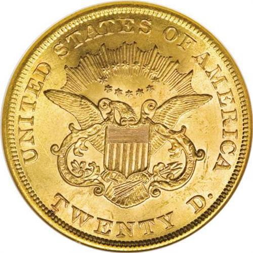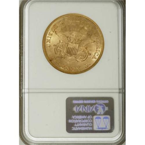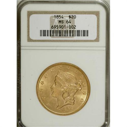 <B>1854 $20 Large Date MS64 NGC.</B></I> It is uncertain when the Large Date variant of the 1854 twenty was discovered, but it had to be prior to 1988, as this variety is listed in Breen's <I>Encyclopedia</B></I> which was released that year. The date is apparently from a logotype used for silver dollars. We disagree with Garrett and Guth when they state "The date size is not hugely dramatic." The few Large Date 1854 twenties we have seen are immediately obvious as the digits in the date fill almost the entire space available in the exergual area. <BR> The breakdown of 1854 twenties from the <I>S.S. Central America </B></I>is interesting with 36 Small Date and 7 Large Date coins recovered. This would indicate that this issue is one that still has many coins left to be discovered in dealer's inventories. Many collectors and dealers are not aware of the Large Date's existence, nor of its rarity and subsequent value. What is extraordinary about this coin is not just that it is a Large Date, but its grade. It is far and away the finest example known. All but one of the coins we have offered in past auctions have been XF or (mostly) AU. We have only sold one Mint State coin, an MS60, and that coin realized $27,600 in our May Long Beach Auction. The NGC <I>Census Report </B></I>shows there are two pieces graded MS60, two in MS61, and three MS62s--which makes this coin the finest by two points. <BR> The surfaces of this piece are remarkably clean and show thick, frosted mint luster. Even reddish-gold color is seen over both obverse and reverse, and the striking details are sharply defined throughout. <BR> <BR> <BR><BR><b>Shipping:</b> Coins & Currency (<a target="_blank" href="http://www.heritageauctions.com/common/shipping.php">view shipping information</a>\)