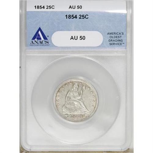 <B>1854 25C Arrows AU50 ANACS.</B></I> NGC Census: (17/328). PCGS Population (27/313). Mintage: 12,380,000. Numismedia Wsl. Price for NGC/PCGS coin in AU50: $183. (#5432)<BR><BR><B>Coin Engraver:</B> Christian Gobrecht<BR><BR><b>Shipping:</b> Coins & Currency (<a target="_blank" href="http://www.heritageauctions.com/common/shipping.php">view shipping information</a>)