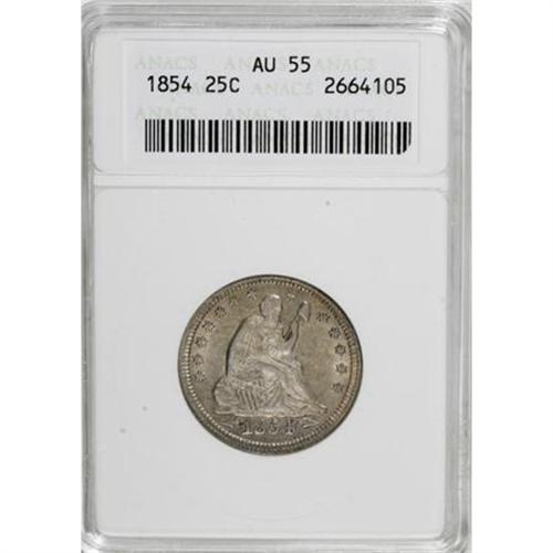 <B>1854 25C Arrows AU55 ANACS.</B></I> NGC Census: (38/275). PCGS Population (45/247). Mintage: 12,380,000. Numismedia Wsl. Price for NGC/PCGS coin in AU55: $275. (#5432)<BR><BR><B>Coin Engraver:</B> Christian Gobrecht<BR><BR><b>Shipping:</b> Coins & Currency (<a target="_blank" href="http://www.heritageauctions.com/common/shipping.php">view shipping information</a>)