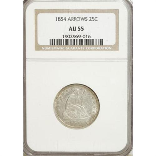 <B>1854 25C Arrows AU55 NGC.</B></I> NGC Census: (38/275). PCGS Population (47/247). Mintage: 12,380,000. Numismedia Wsl. Price for NGC/PCGS coin in AU55: $275. (#5432)<BR><BR><B>Coin Engraver:</B> Christian Gobrecht<BR><BR><b>Shipping:</b> Coins & Currency (<a target="_blank" href="http://www.heritageauctions.com/common/shipping.php">view shipping information</a>)