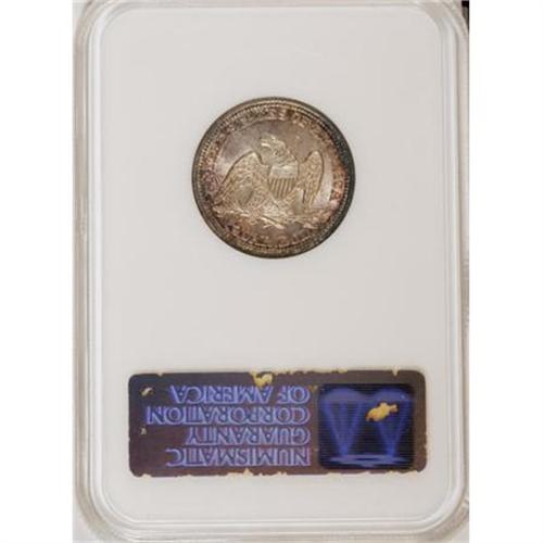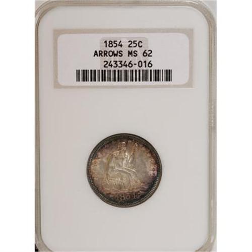 <B>1854 25C Arrows MS62 NGC.</B></I> Beautiful emerald-green and plum-red adorn the peripheries of this lustrous and crisply struck Arrows quarter. Smooth for the grade, highly attractive, and housed in an older generation holder.<BR><BR><B>Coin Engraver:</B> Christian Gobrecht<BR><BR><b>Shipping:</b> Coins & Currency (<a target="_blank" href="http://www.heritageauctions.com/common/shipping.php">view shipping information</a>)